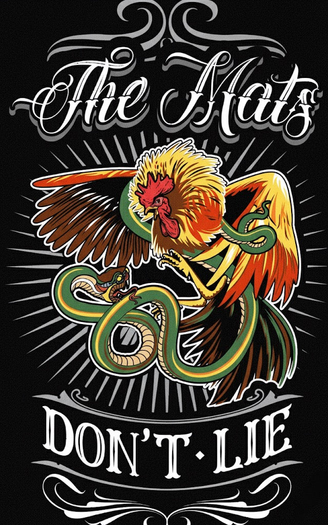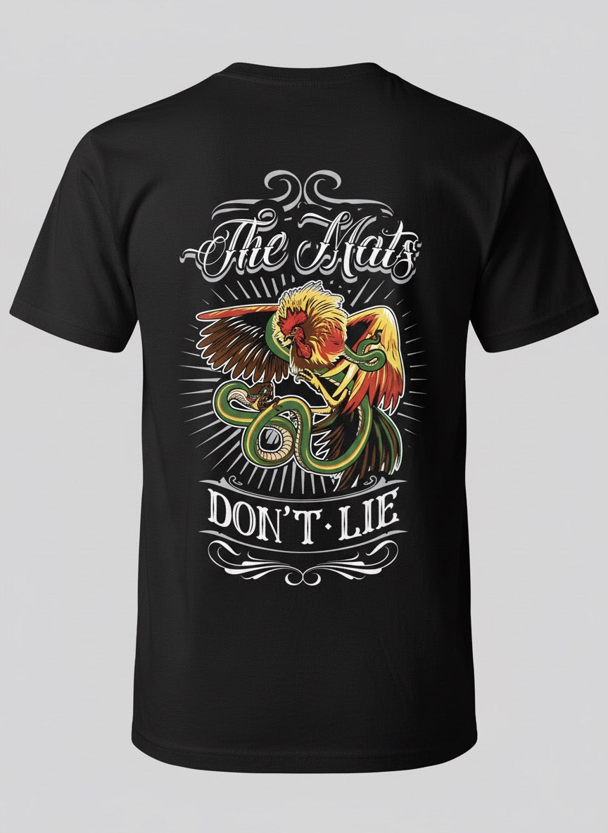 Crafted from premium, soft black fabric, this tee provides both comfort and a bold canvas for the intricate artwork. The back of the shirt proudly displays a stunning, colorful illustration: a majestic rooster, wings spread and spurs ready, locked in an epic battle with a coiled, venomous snake. Above and below, the stylized text "The Mats Don't Lie" adds an extra layer of meaning, suggesting that in any true contest, the truth of strength and spirit is always revealed.