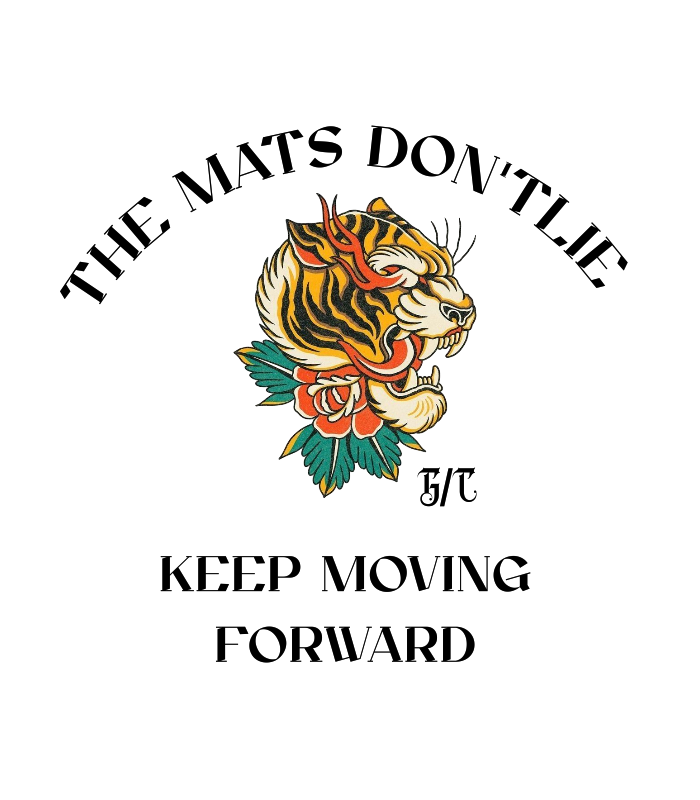A Message That Resonates: Turn heads and inspire action with the impactful graphics on the back. "THE MATS DON'T LIE" arcs above the iconic tiger, followed by "G/C” and the mantra: "KEEP MOVING FORWARD." These words are a tribute to discipline, truth, and the relentless pursuit of progress.