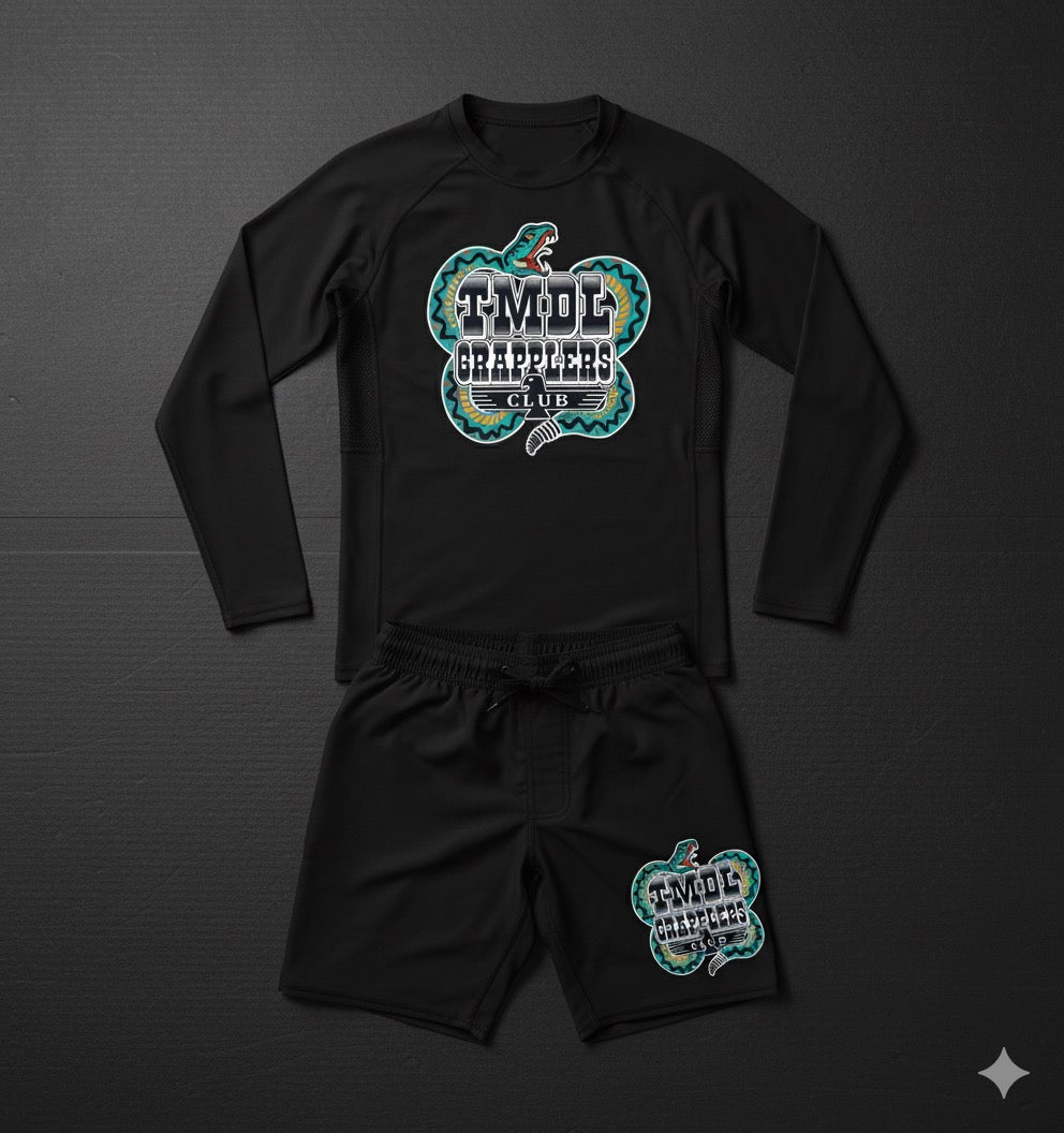 Unleash your inner stealth and precision with "The Bandito" Rash Guard and Fight Shorts. Featuring a captivating serpent design coiled around the "TMDL Grapplers Club" emblem, this sleek black set combines top-tier performance with a distinctive, striking look. Engineered for the mat, its moisture-wicking fabric keeps you cool and comfortable, while the durable construction stands up to every roll. Dominate with the quiet confidence of "The Bandito."